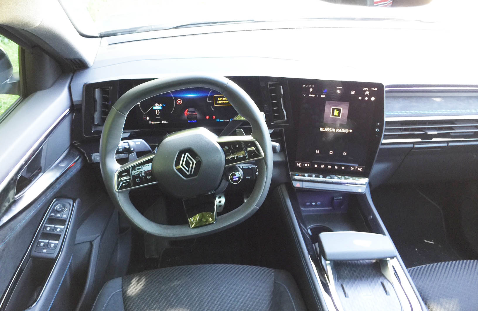 Das Cockpit kennen wir schon vom Megane E-Tech, im Austral wirkt es aber noch stimmiger und hochwertiger. Insgesamt zeigt es sich übersichtlich und gut bedienbar – zumindest in der Mitte, wo auch die Kippschalter für die Zwei-Zonen-Klima platziert sind. Am Lenkrad herrscht allerdings Hebelterror: Zur Wischerbedienung gesellen sich der neue, Mercedes-artige Wählstock und der Renault-typische Radiosatellit.